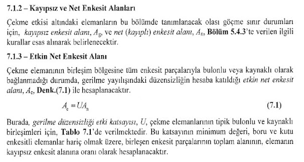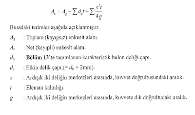 Akma sınırında kayıpsız enkesit alanı, kırılma sınırında ise etkin net enkesit alanı dikkate alınır. Bu net alan, bağlantı tipi (bulonlu/kaynaklı) ve gerilim düzensizliği katsayısına (U) göre hesaplanır.