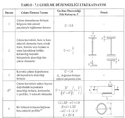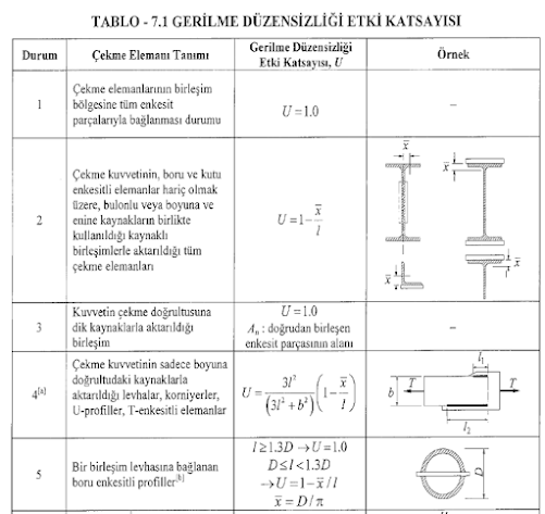 Türk Çelik Yapılar Yönetmeliği Tablo 7.1’de bağlantı tiplerine göre U katsayısı verilmektedir. Örneğin: