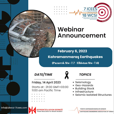 🎙️ The webinar will feature initial observations from the recent Kahramanmaraş earthquakes and share important research outcomes and engineering assessments. It will also act as a precursor to the 18th World Conference on Seismic Isolation and the 7th International Conference on Earthquake Engineering and Seismology (18WCSI–7ICEES), which will be held on November 6–10, 2023.
